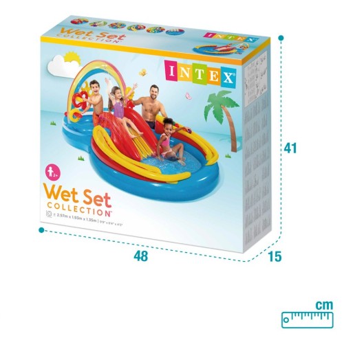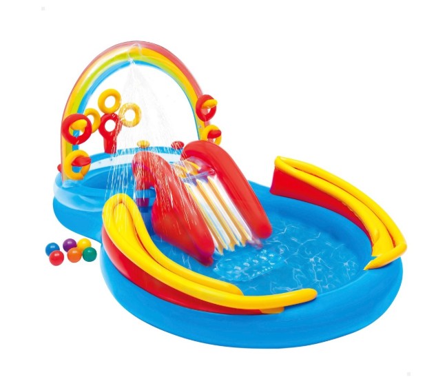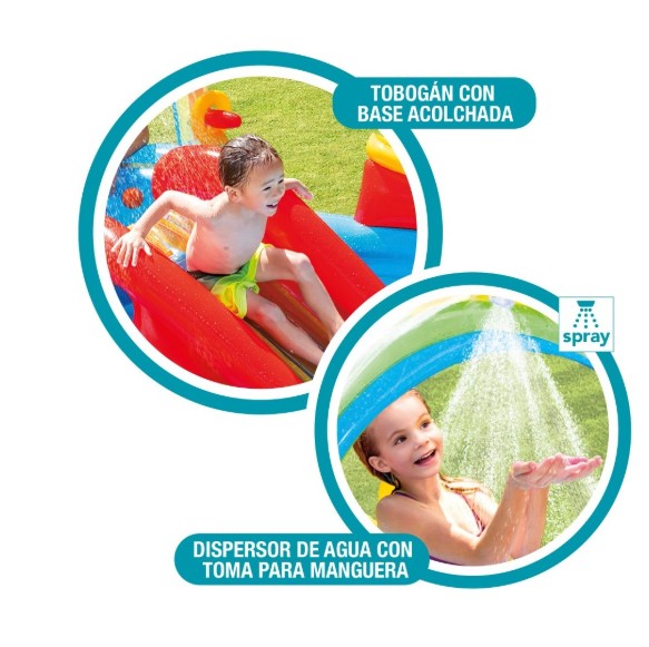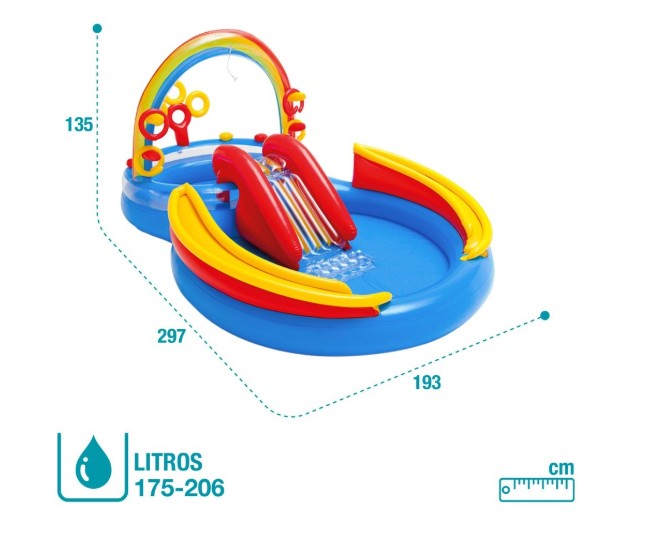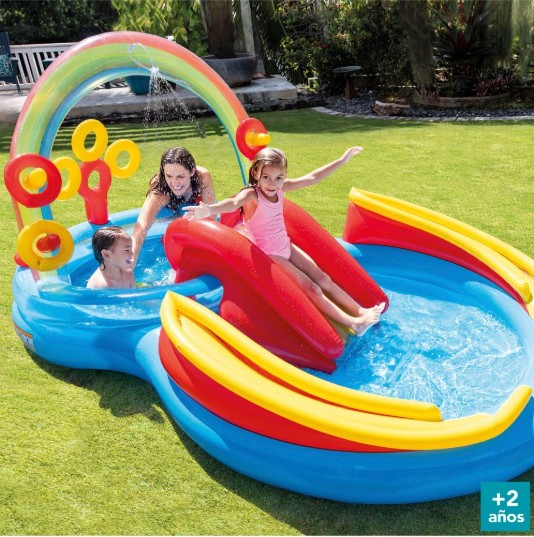 - Centro de juegos hinchable Intex con forma circular y un arco superior con pulverizador. Medidas: 297x193x135 cm