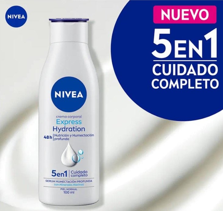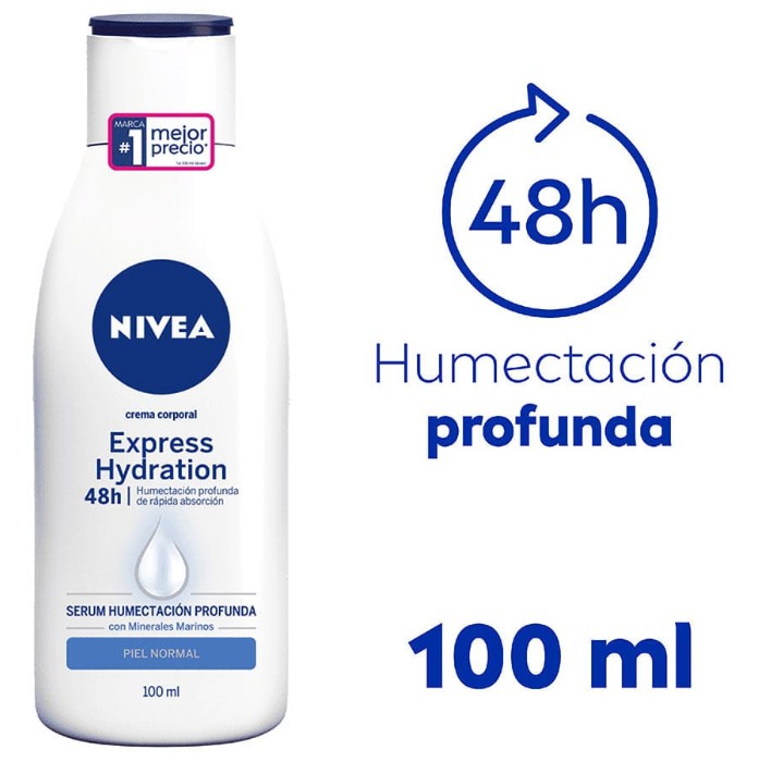 Crema corporal Express Hydration 100ml. Ultra ligera de rápida absorción, que gracias a su Serum de Humectación Profunda con Minerales Marinos, deja tu piel visiblemente más suave y humectada por 48h.