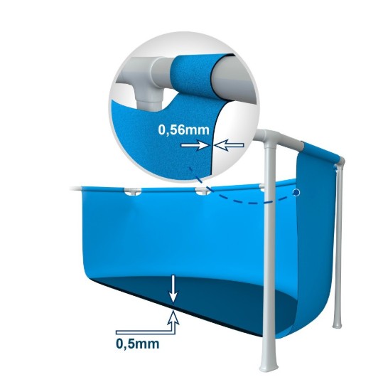 Diseño: fabricada en color azul, con tejido resistente de tres capas laminadas de PVC-Poliéster que aportan mayor firmeza y resistencia, estructura metálica con barras de acero con acabado epoxi antióxido